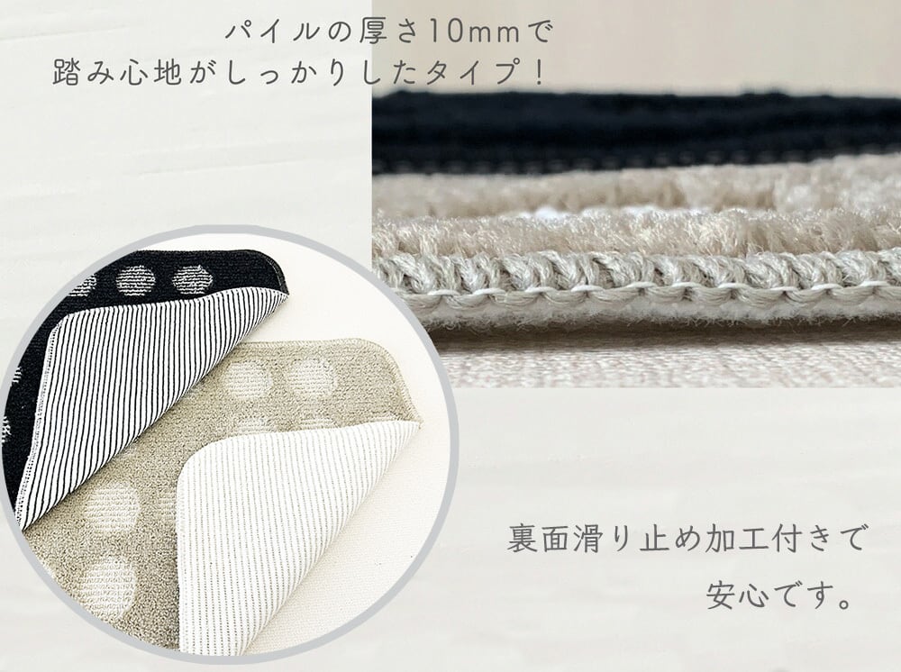 ●この商品は、パイルにはっ水加工による防汚機能を施しておりますがマットの性質上、しょう油やソース等の液体をそのまま放置しますと、パイルの隙間に流れ込みます。